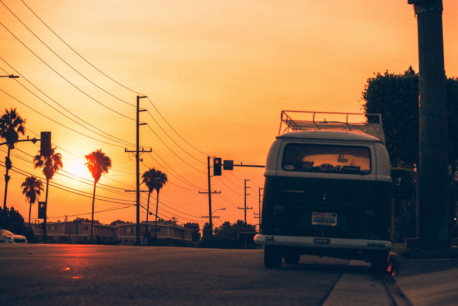 A vintage Volkswagen bus idles at the curb under a fiery California sunset, its silhouette framed by swaying palm trees and the hum of telephone wires. Captured in rich, cinematic tones, this scene evokes the timeless allure of West Coast evenings—where the day slows, the light glows, and the road calls you toward the horizon.
