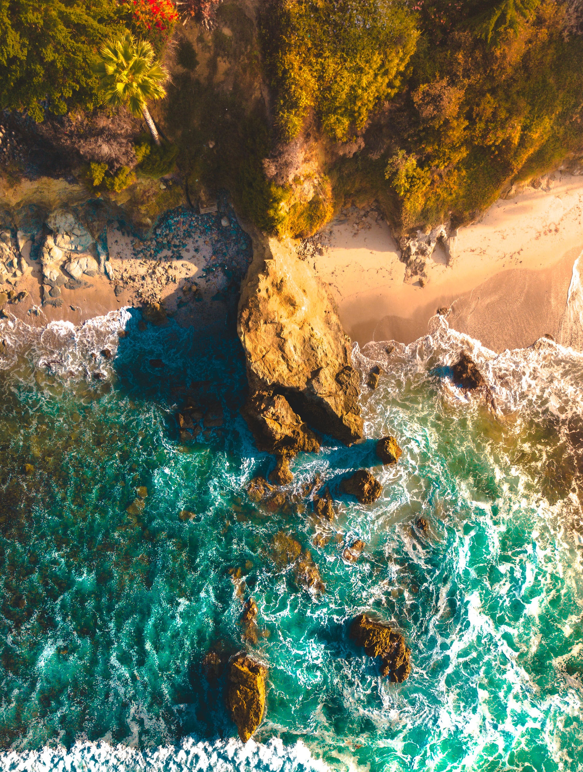 The turquoise waters of Laguna Beach crash against golden coastal cliffs, framed by lush greenery and hidden coves. A bird’s-eye view of one of California’s most iconic shorelines, alive with texture and color.