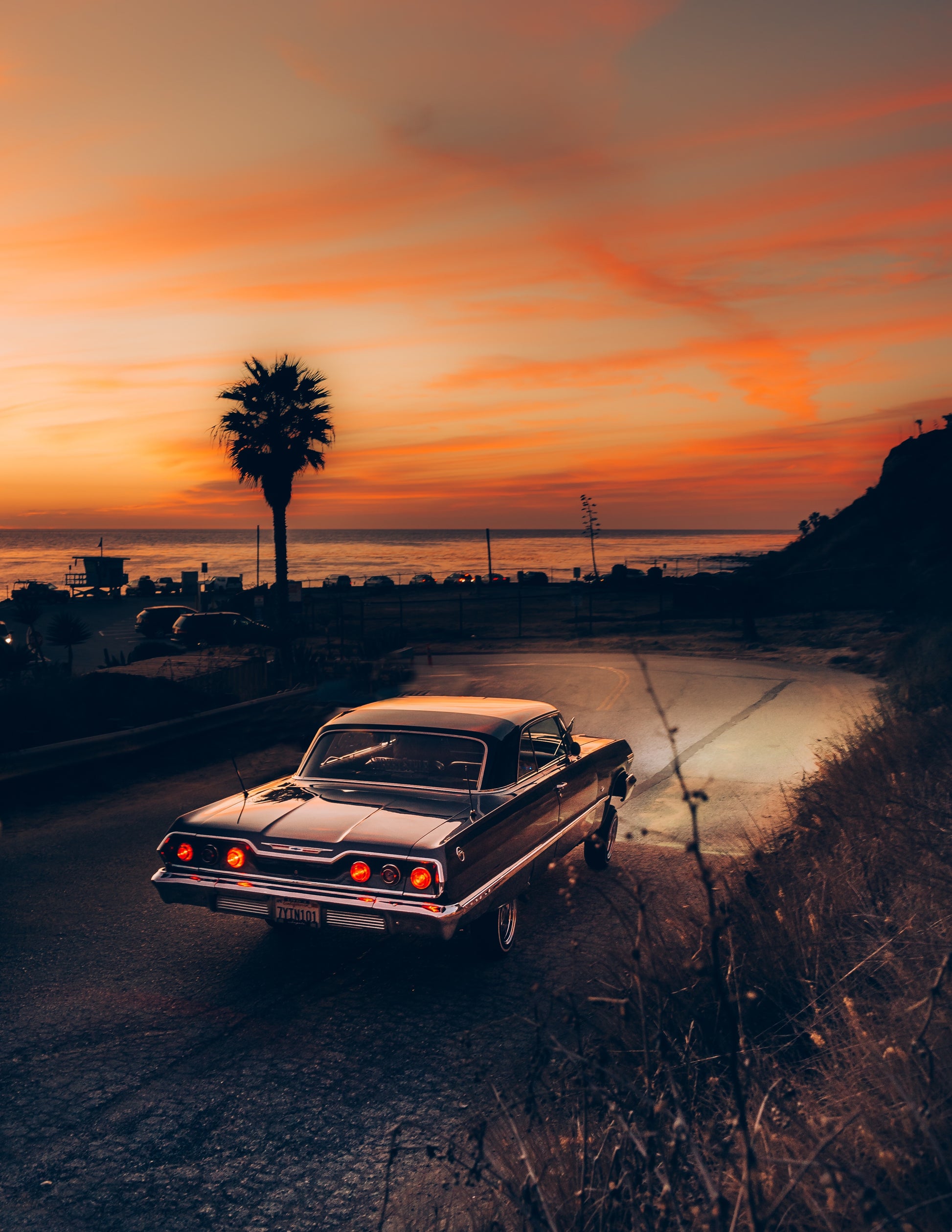 A '63 Impala caught in motion as the last light slips behind the sea.