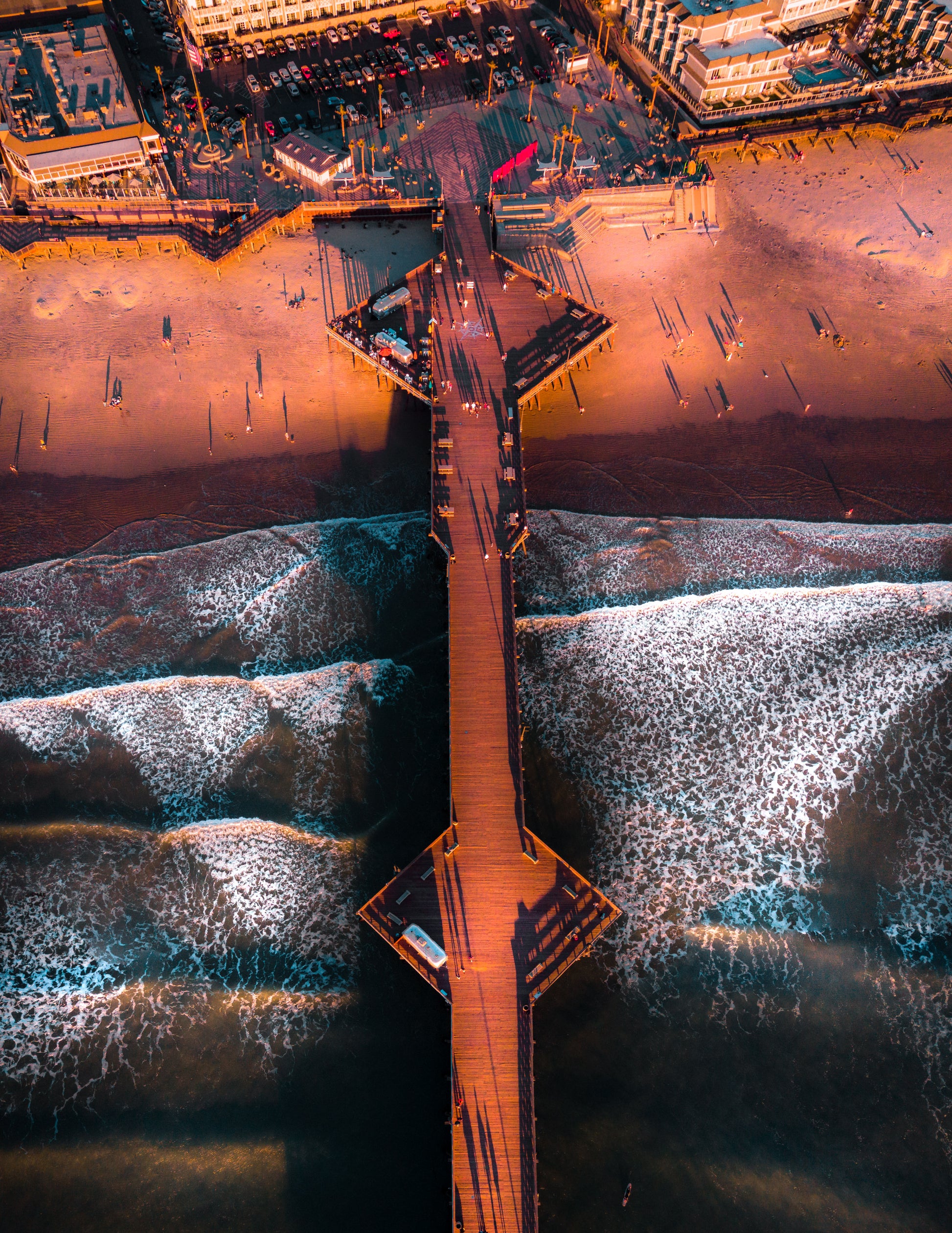 A sweeping aerial view of Pismo Beach Pier glowing in the last light of day. Long shadows stretch across the wooden planks and the shoreline, while the Pacific’s waves shimmer with soft blues and golds. Captured from above, this fine art print highlights the meeting point of ocean, architecture, and warm California light — a timeless coastal moment.