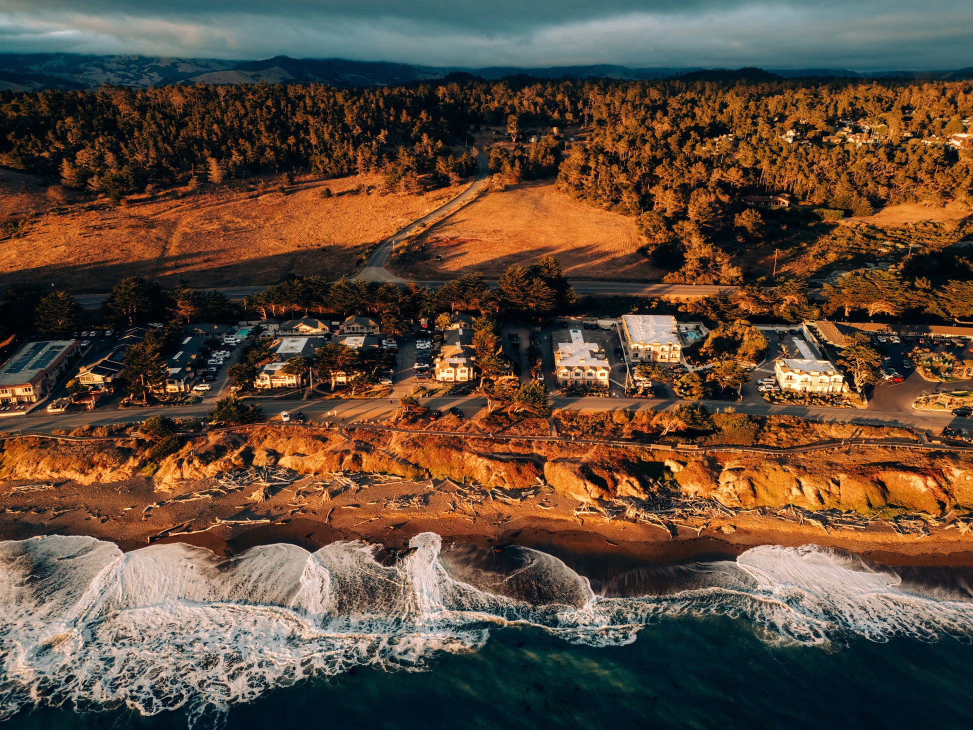 Where the forest ends and the ocean begins. Aerial view of Cambria's coast at sunset.
